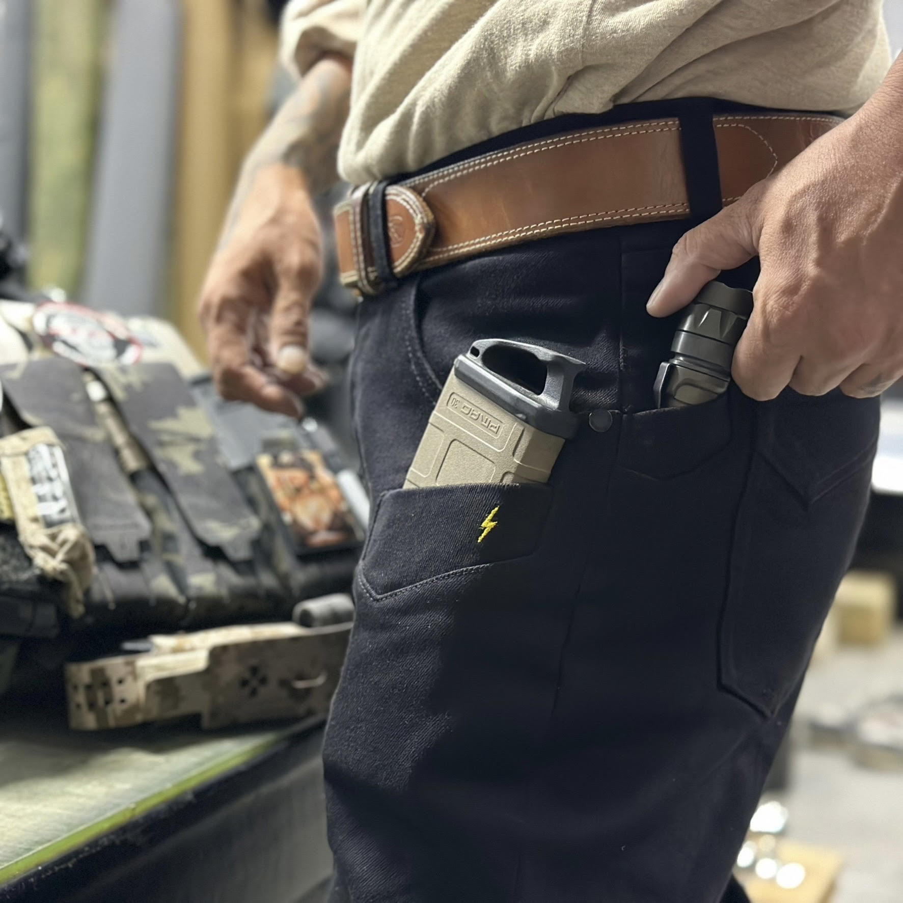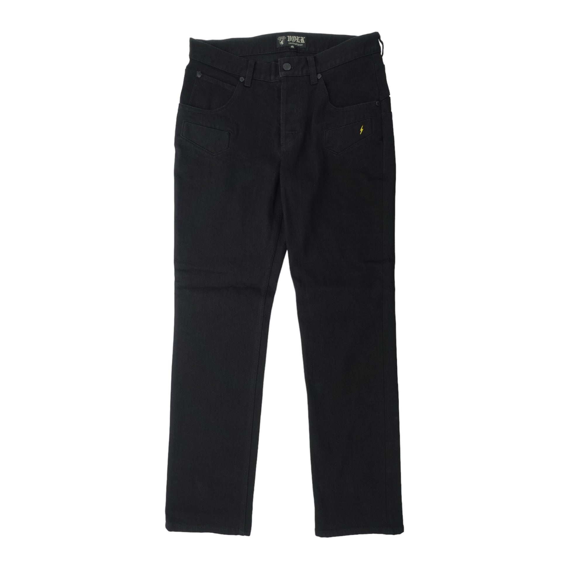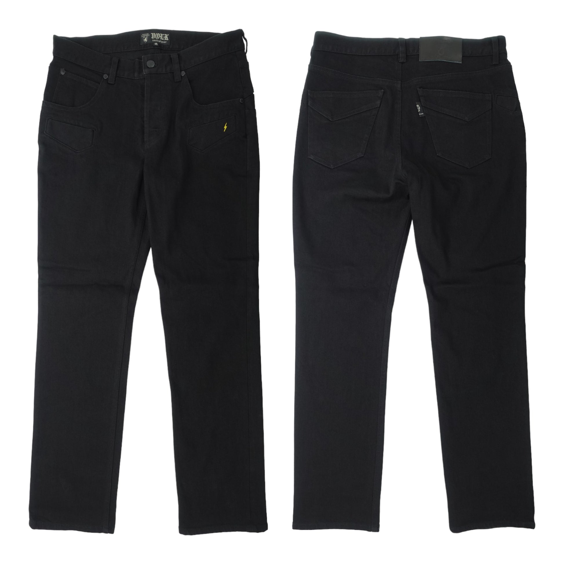 スマホやマガジンを入れるのにピッタリな太ももポケットの刺繍は濃いブラックの中に強いアクセントとなるイナズマロゴに。