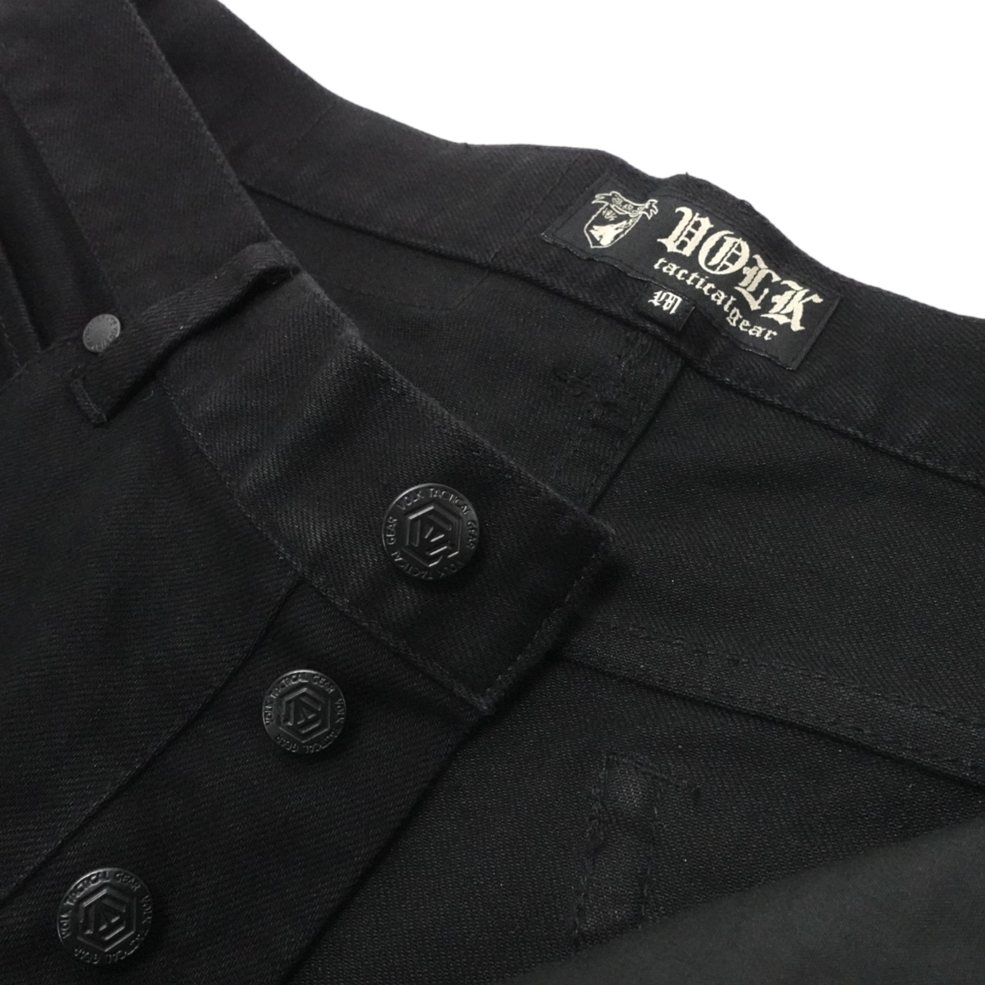 トップボタンを含むフロントフライ全てのボタンはHEXlogoをVOLK TACTICAL GEARの文字で囲んだデザイン。