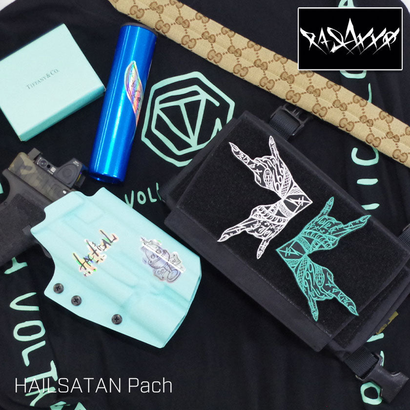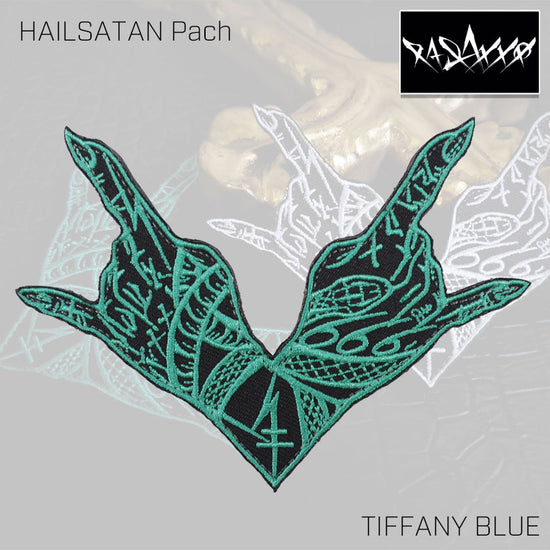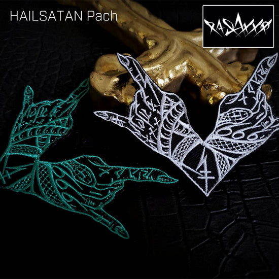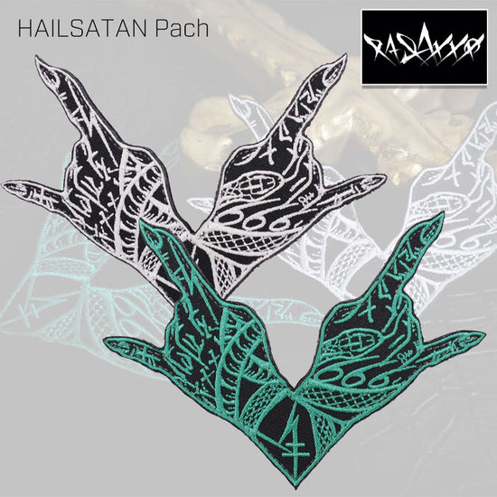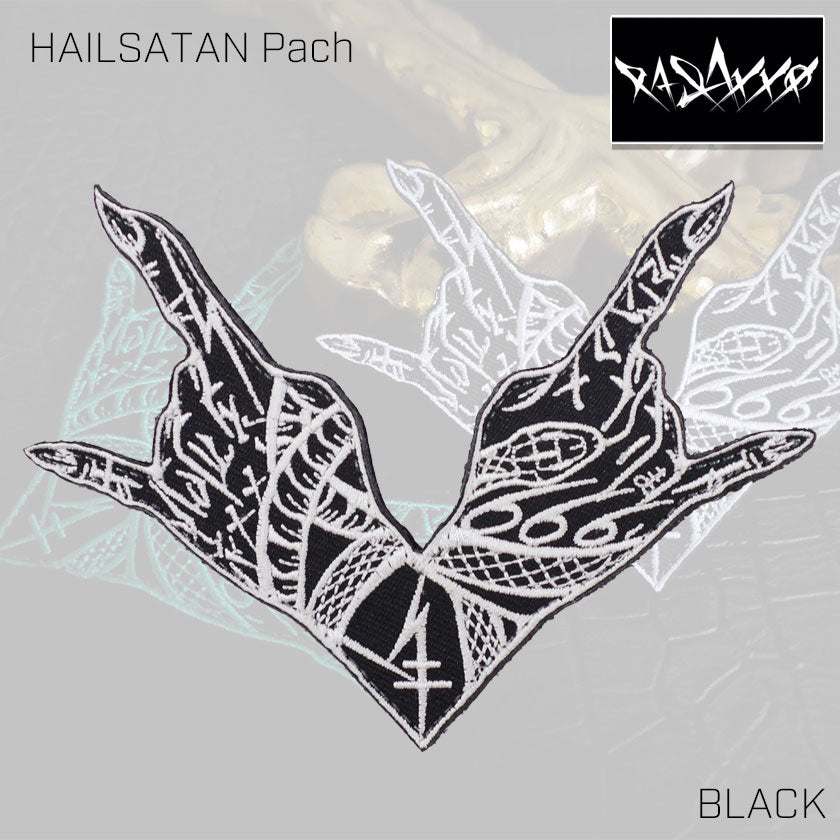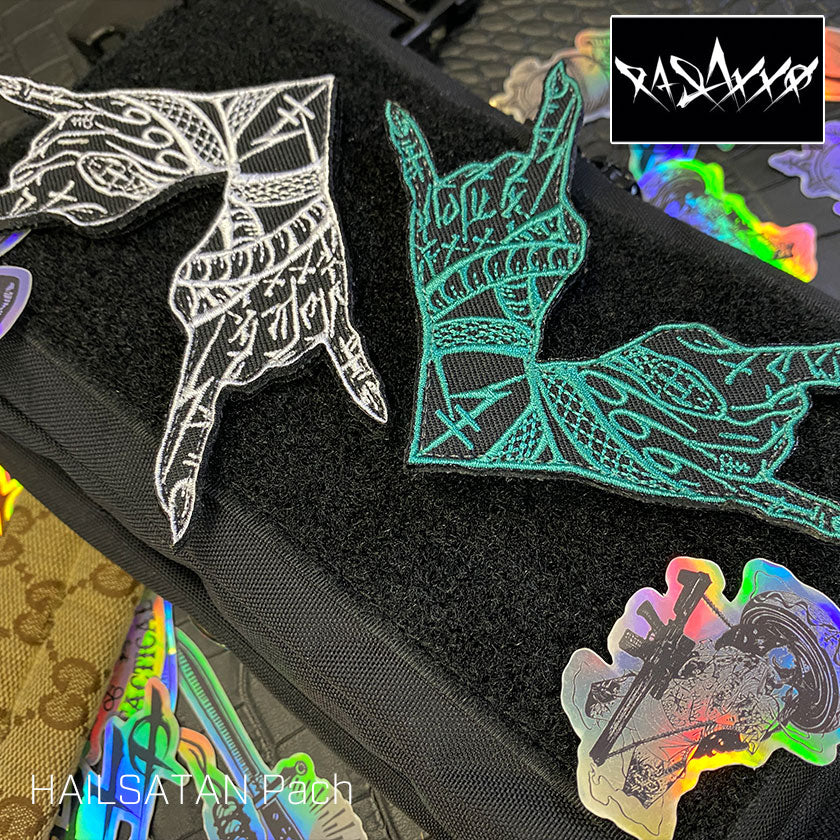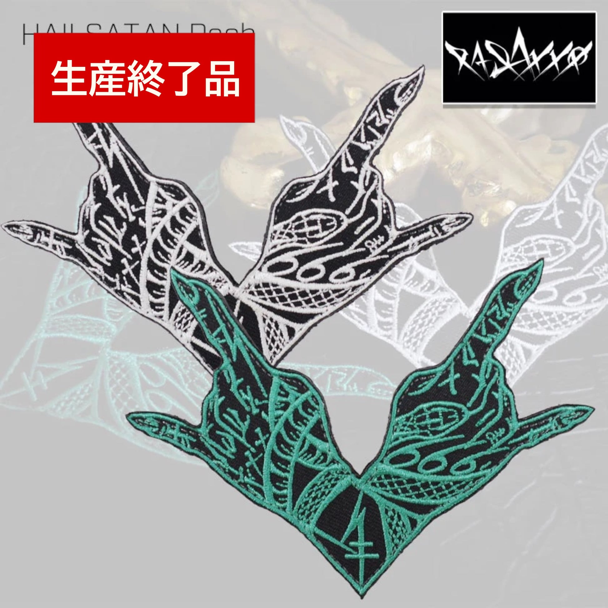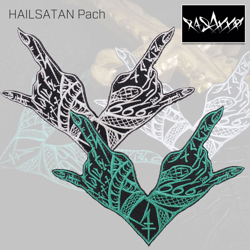 HAILSATANのハンドサインをベースに666/ウロボロス/逆十字/稲妻など両ブランドのモチーフを散りばめたデザイン。