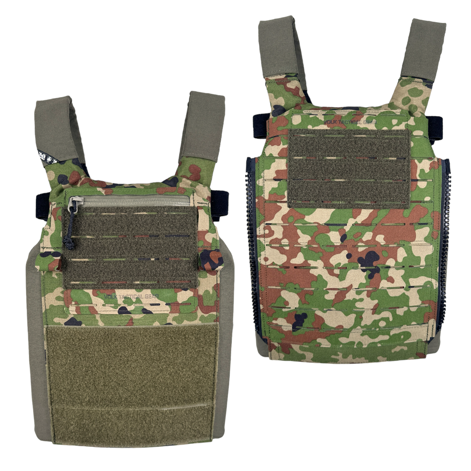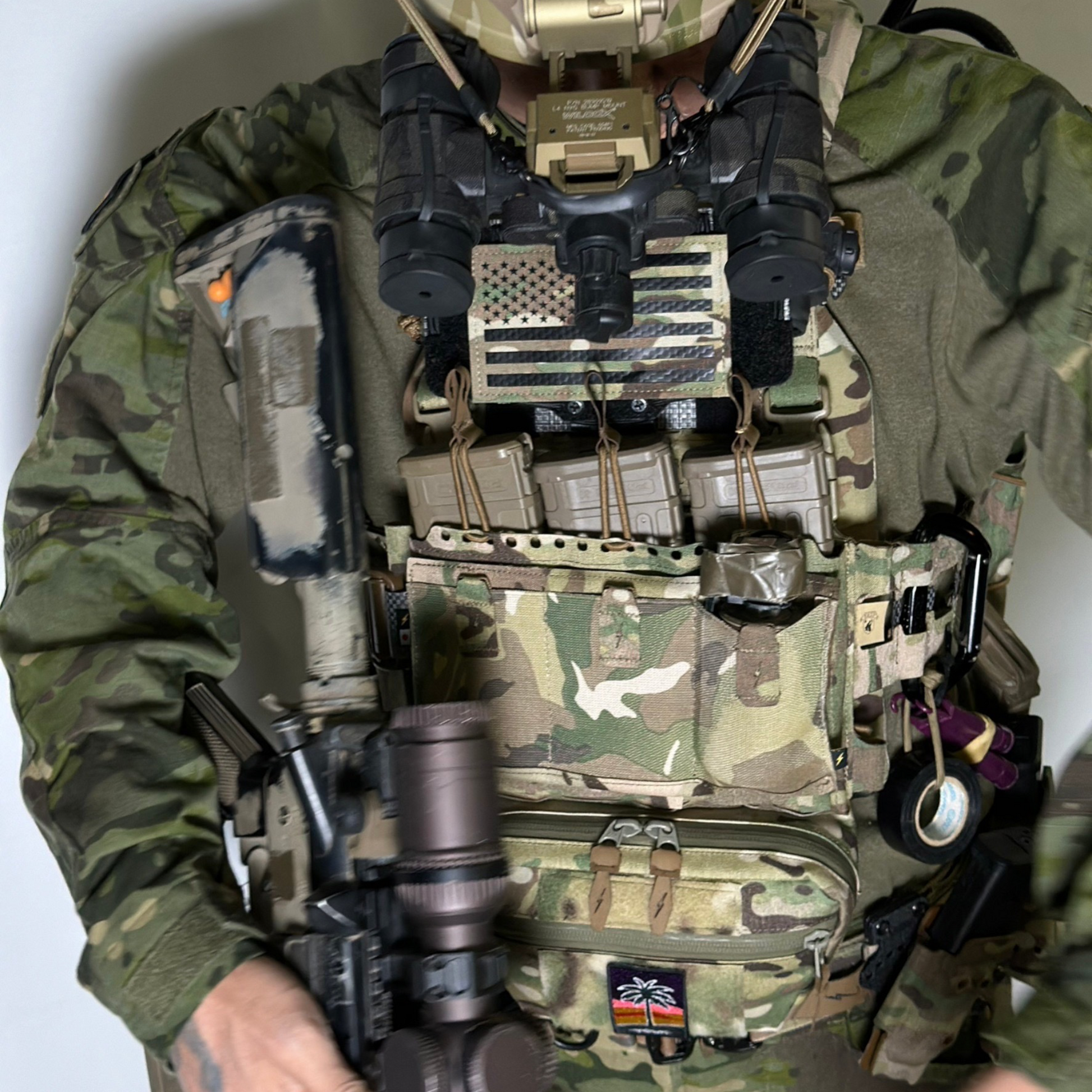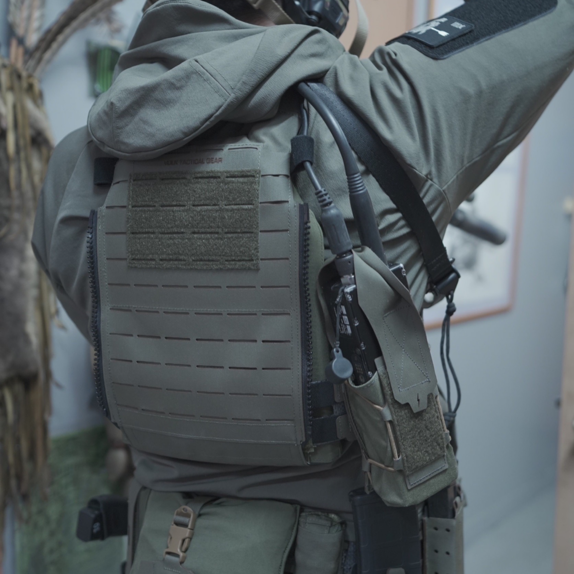 止水ジッパー採用の胸部ポケットには小さめのメモ帳や、薄い物、余ったコードの処理等に利用できます。プレートバッグ前後にはレーザーカットしたモールスリットを配したベルクロループ(メス)を配備しておりモール対応の装備の装着やパッチを貼り付けられます。