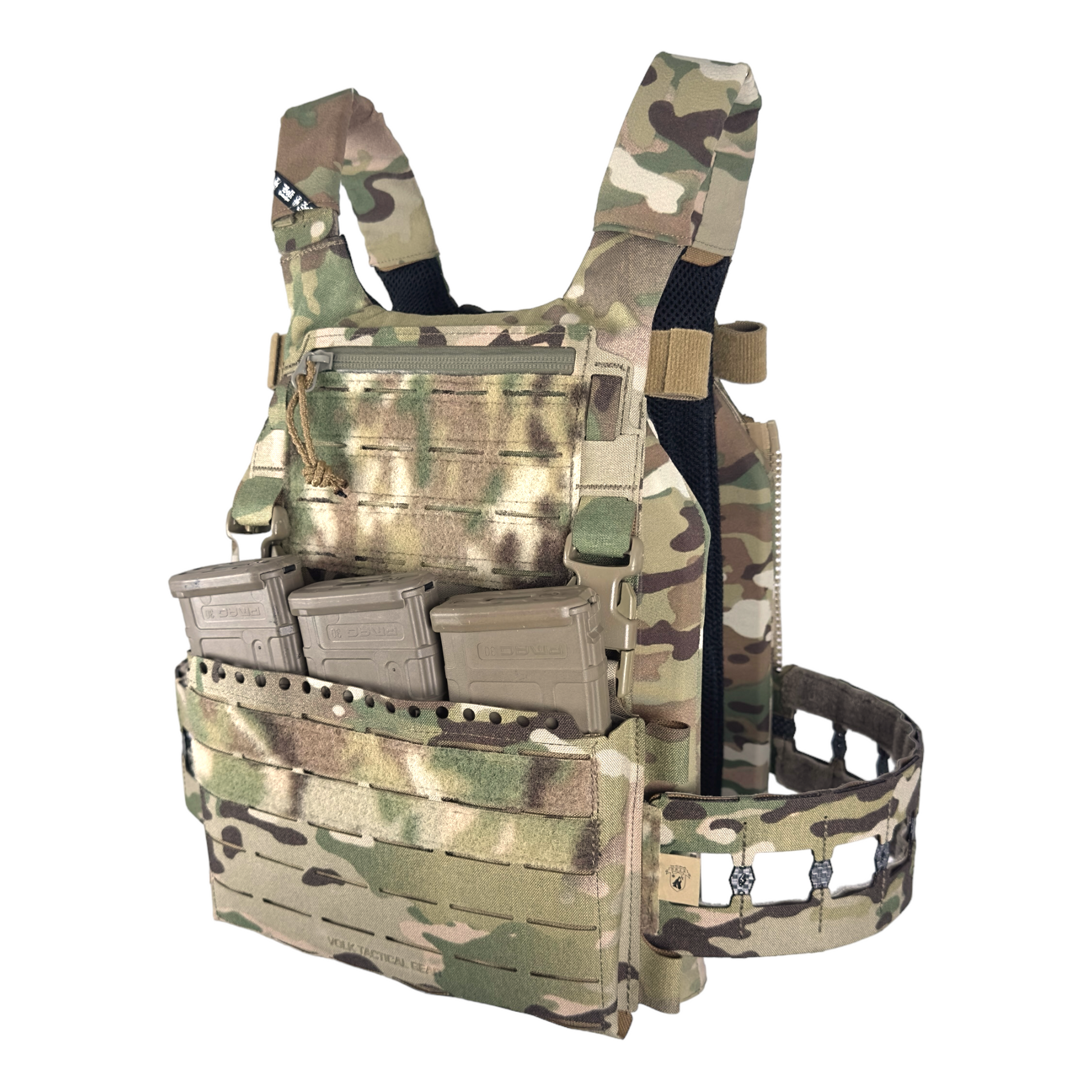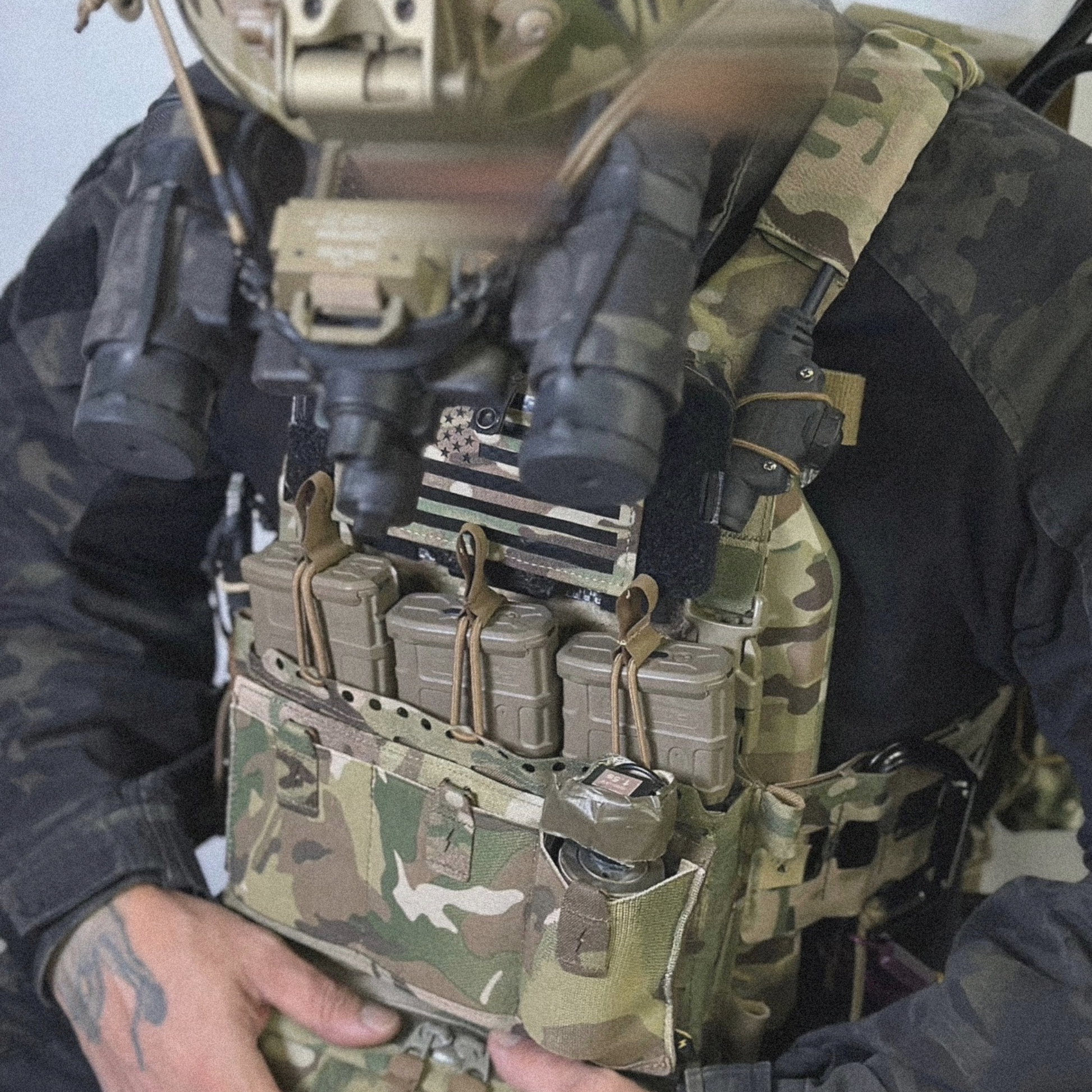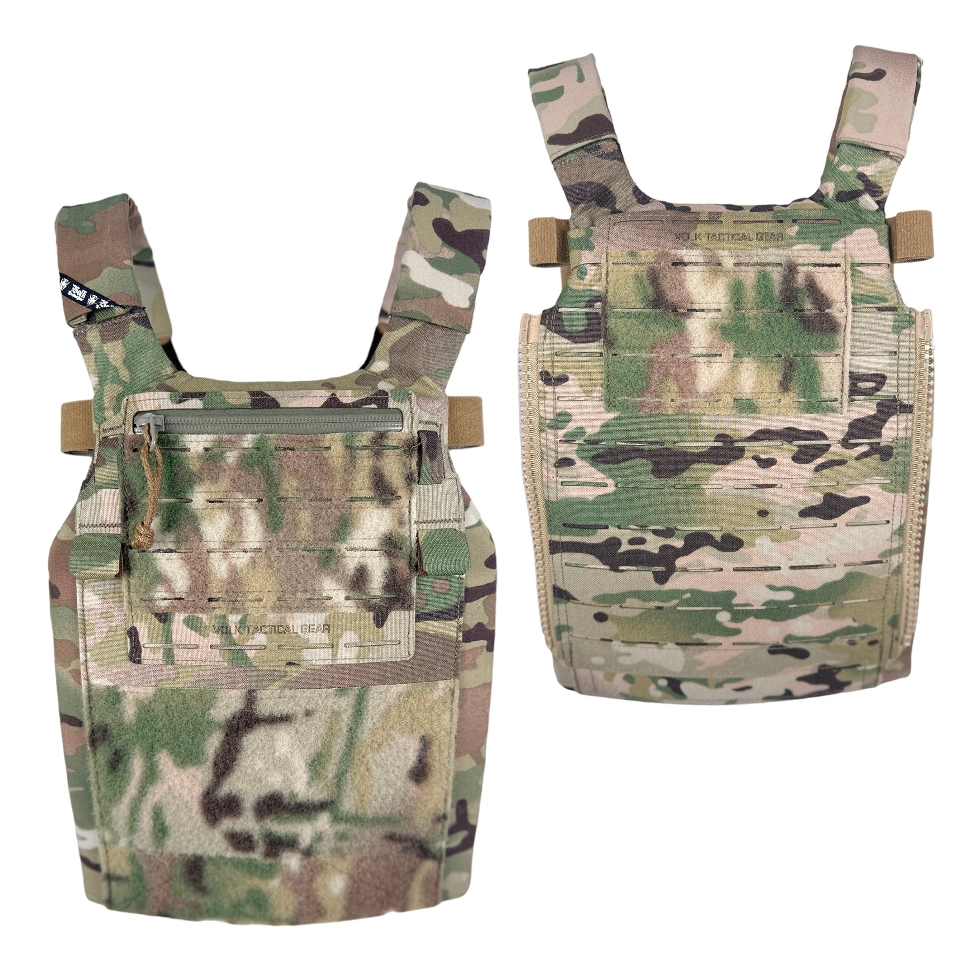止水ジッパー採用の胸部ポケットには小さめのメモ帳や、薄い物、余ったコードの処理等に利用できます。プレートバッグ前後にはレーザーカットしたモールスリットを配したベルクロループ(メス)を配備しておりモール対応の装備の装着やパッチを貼り付けられます。