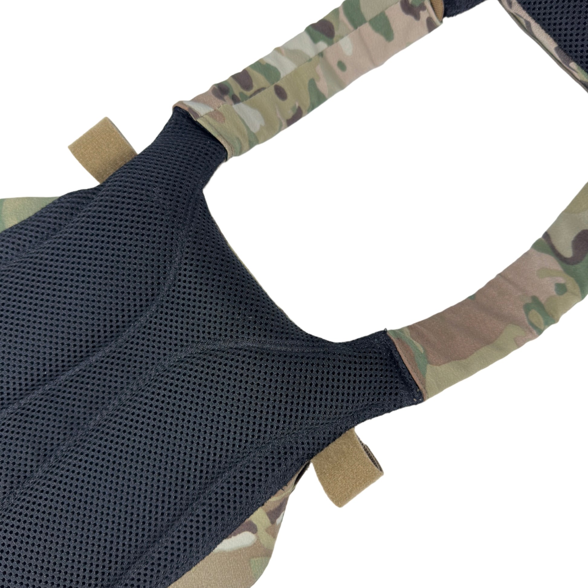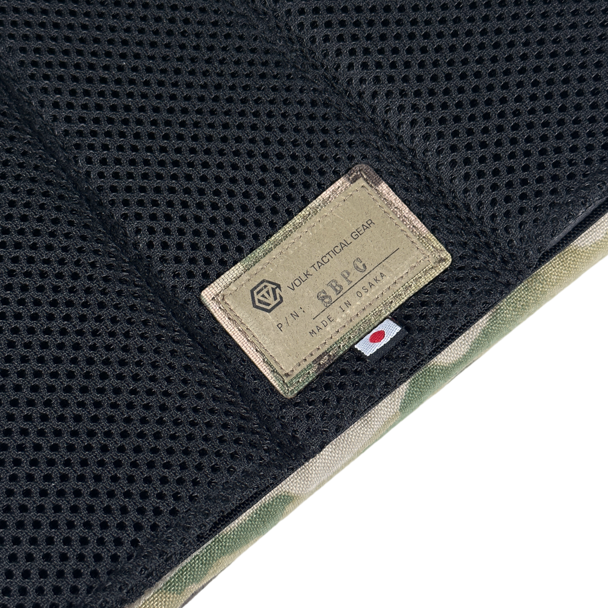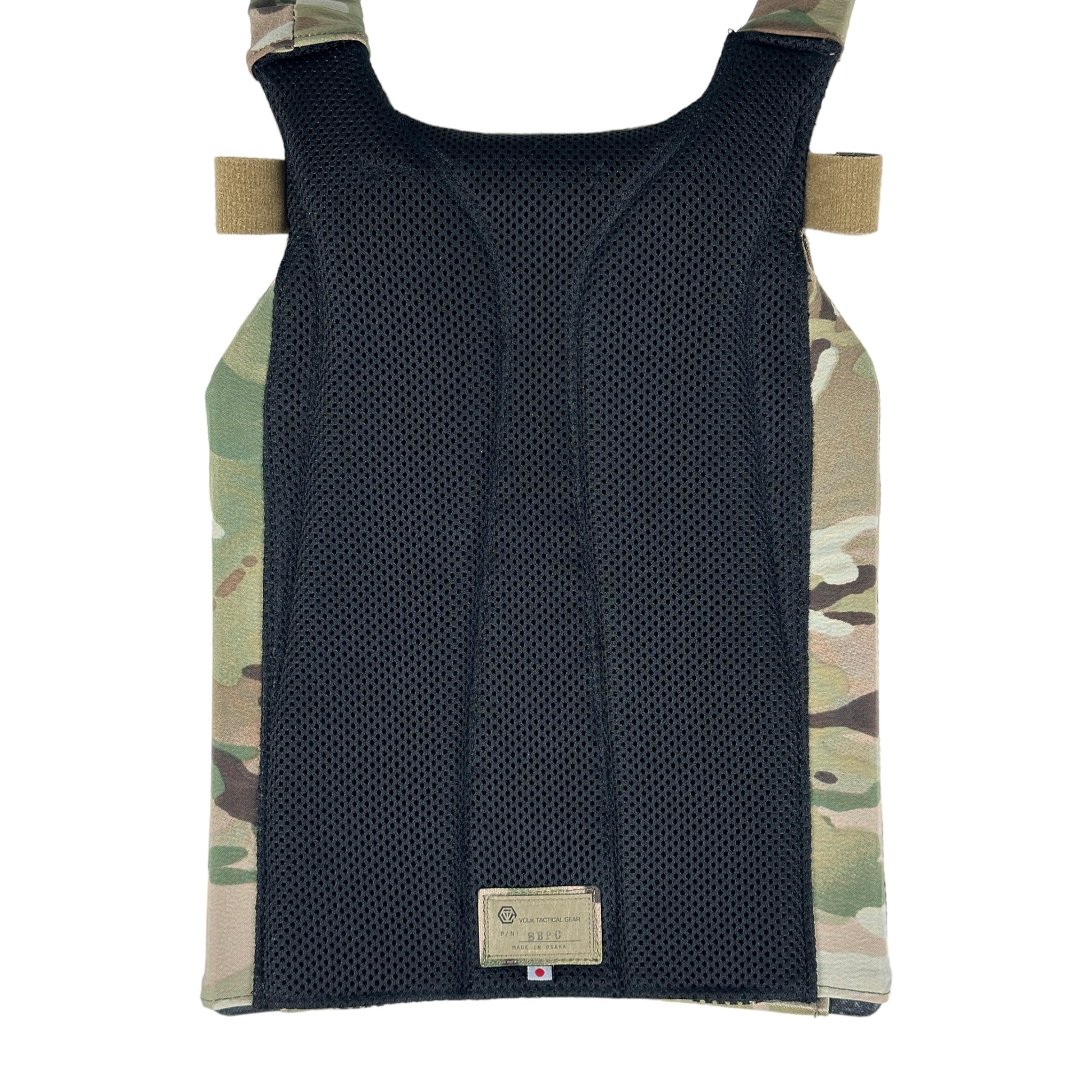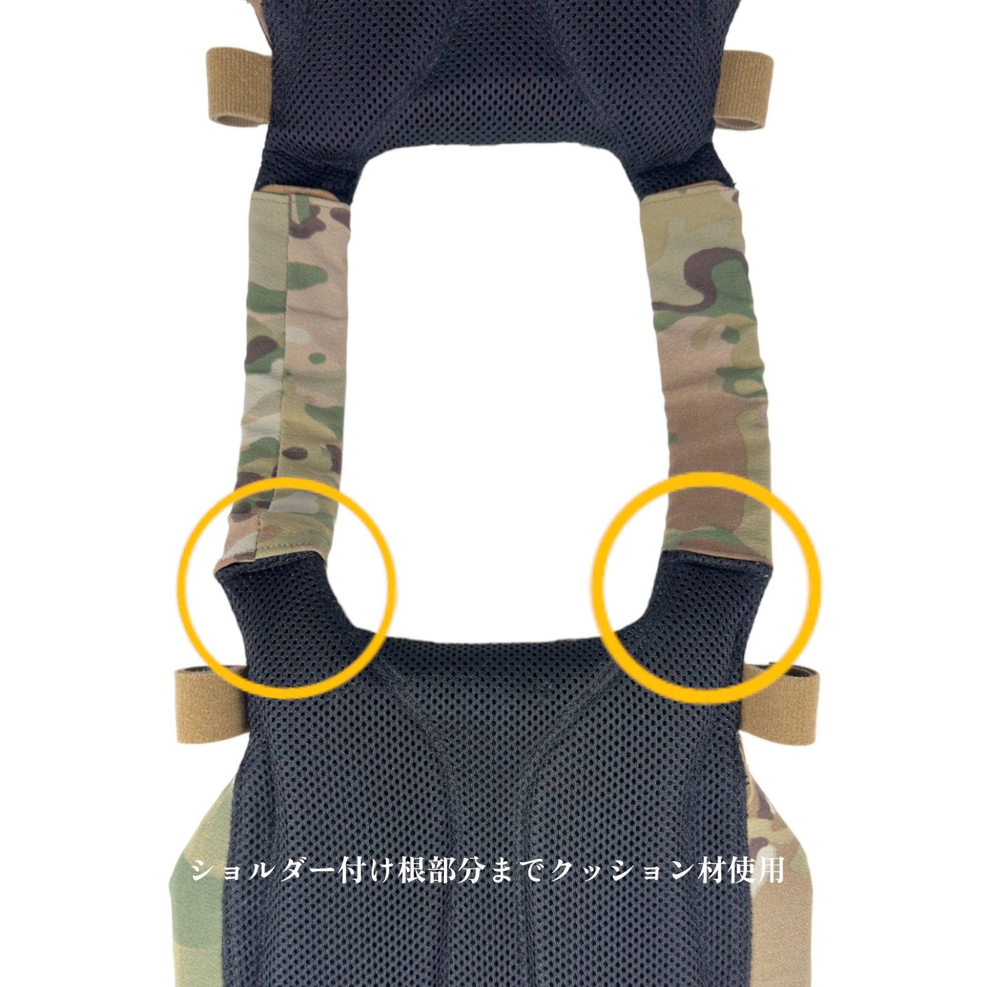 肩部分のリリース機能を削り、ショルダーストラップを限界まで首側に寄せる事で生じたスペースにより、ストックをプレートに沿う様に付けられる事で肩付けがし易くなっている。同時に肩の可動範囲も確保しています。ショルダーストラップの幅を内側に狭めた分、プレートバッグの首元部分の余分を最小に最適化し前後の幅を広げました。これにより、頭の出し入れの影響を少なくしています。