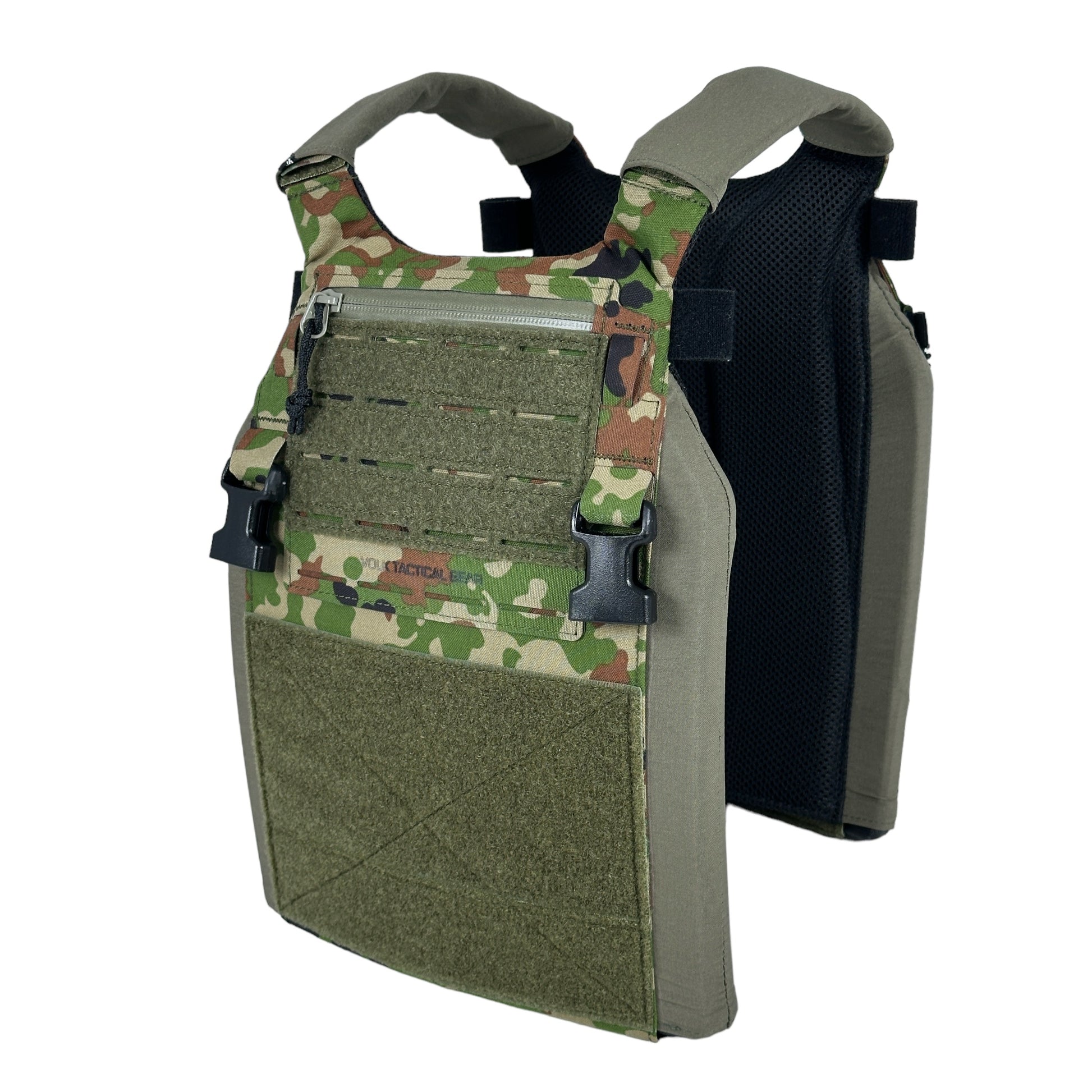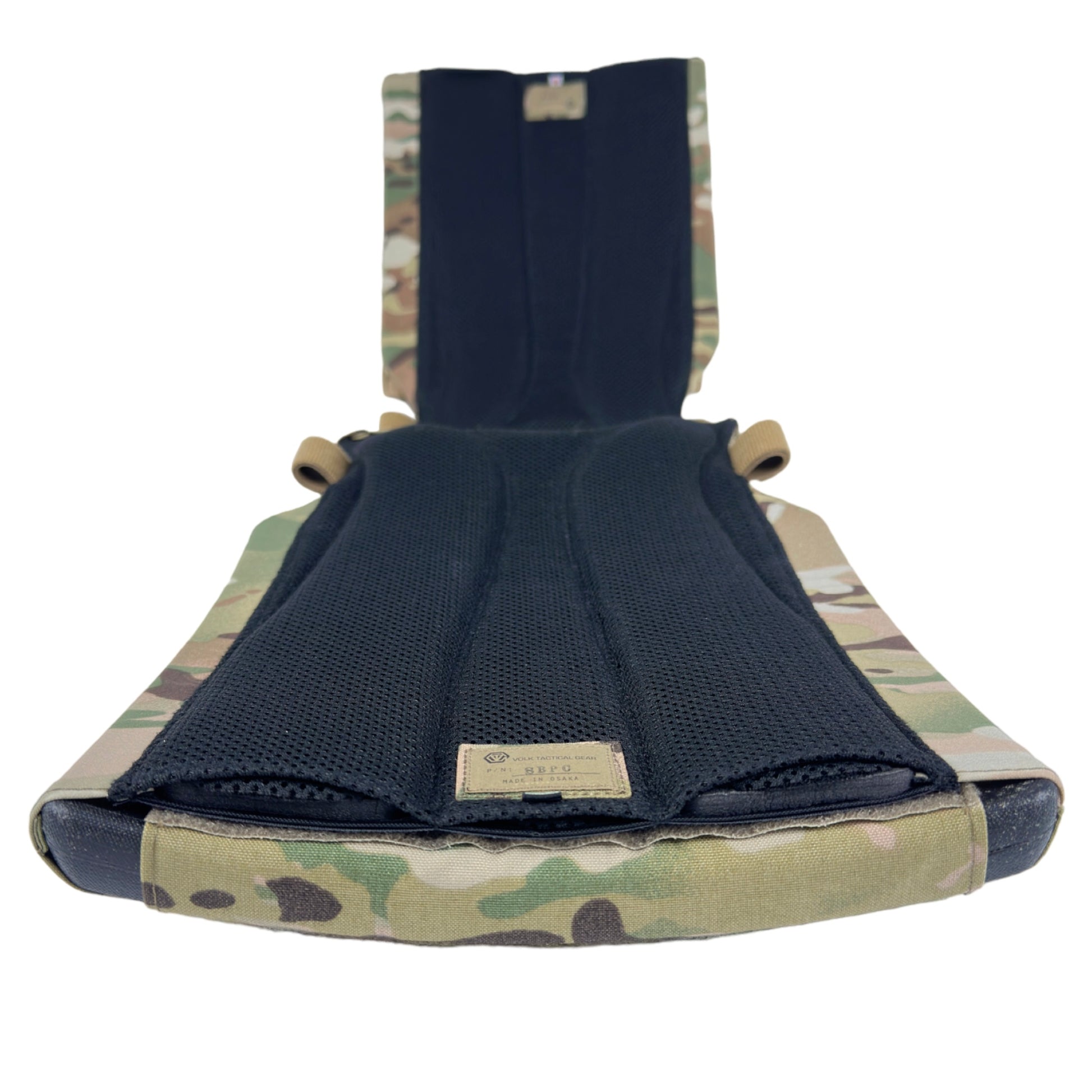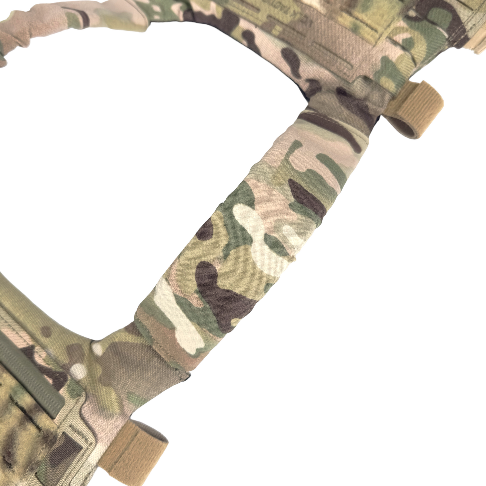 肩部分のリリース機能を削り、ショルダーストラップを限界まで首側に寄せる事で生じたスペースにより、ストックをプレートに沿う様に付けられる事で肩付けがし易くなっている。同時に肩の可動範囲も確保しています。ショルダーストラップの幅を内側に狭めた分、プレートバッグの首元部分の余分を最小に最適化し前後の幅を広げました。これにより、頭の出し入れの影響を少なくしています。