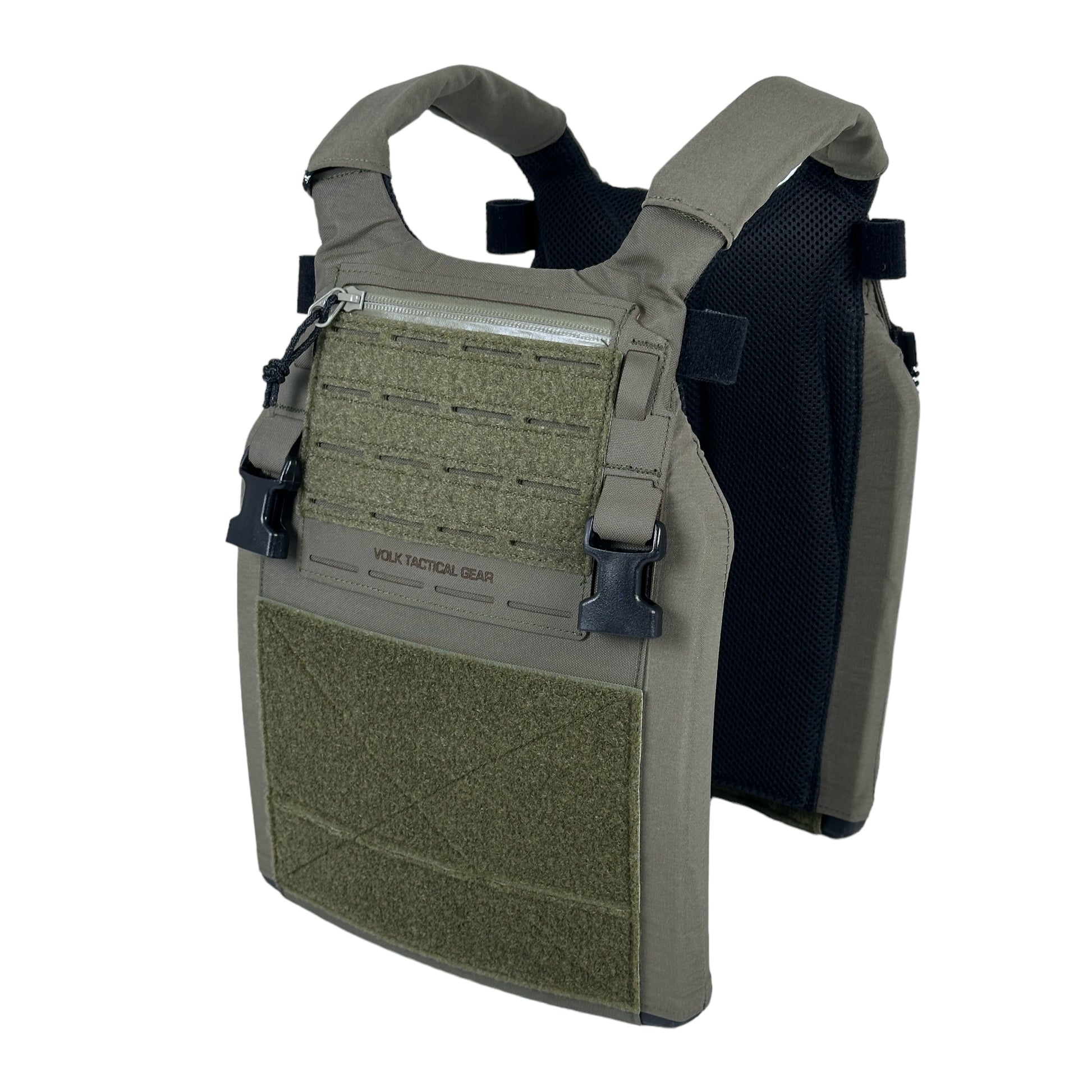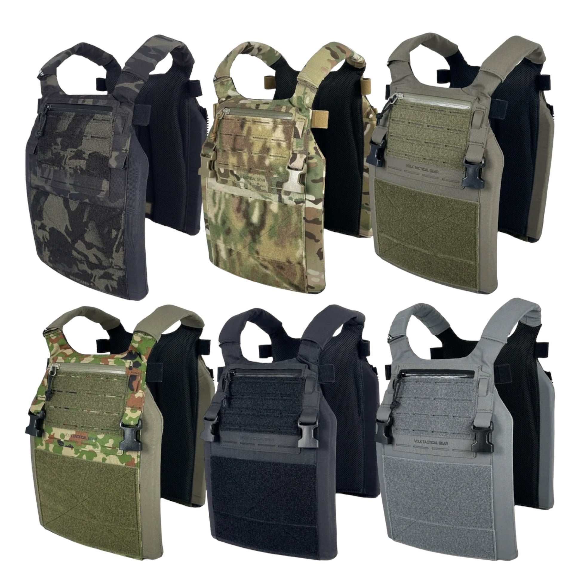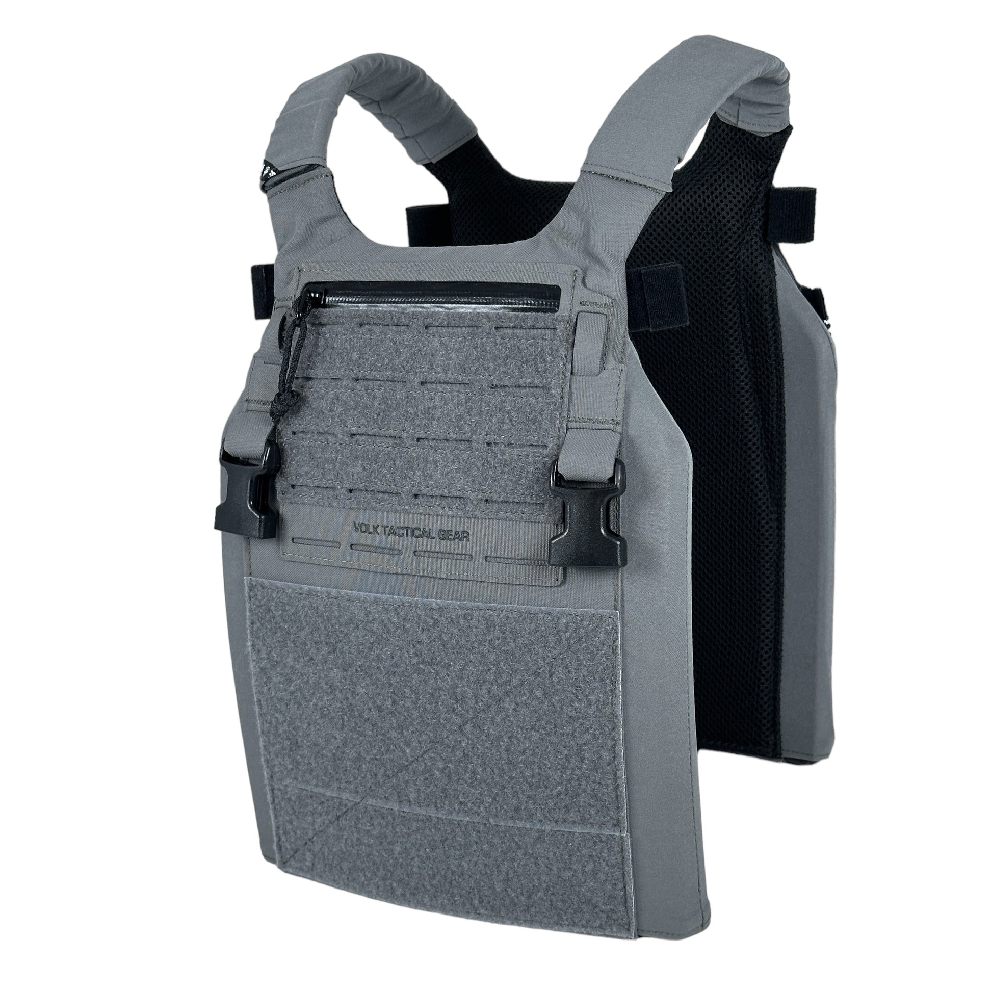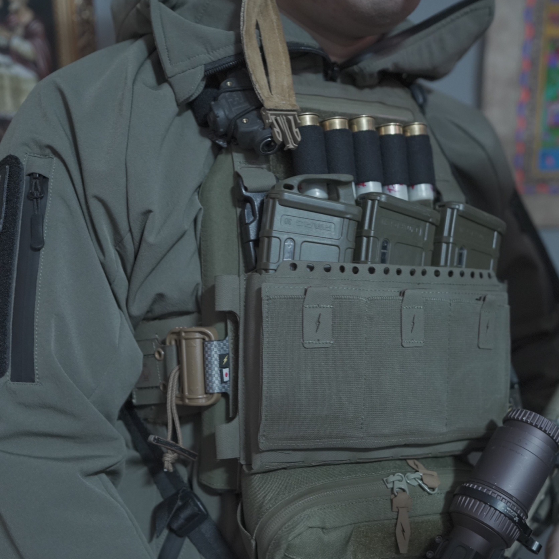 肩部分のリリース機能を削り、ショルダーストラップを限界まで首側に寄せる事で生じたスペースにより、ストックをプレートに沿う様に付けられる事で肩付けがし易くなっている。同時に肩の可動範囲も確保しています。ショルダーストラップの幅を内側に狭めた分、プレートバッグの首元部分の余分を最小に最適化し前後の幅を広げました。これにより、頭の出し入れの影響を少なくしています。