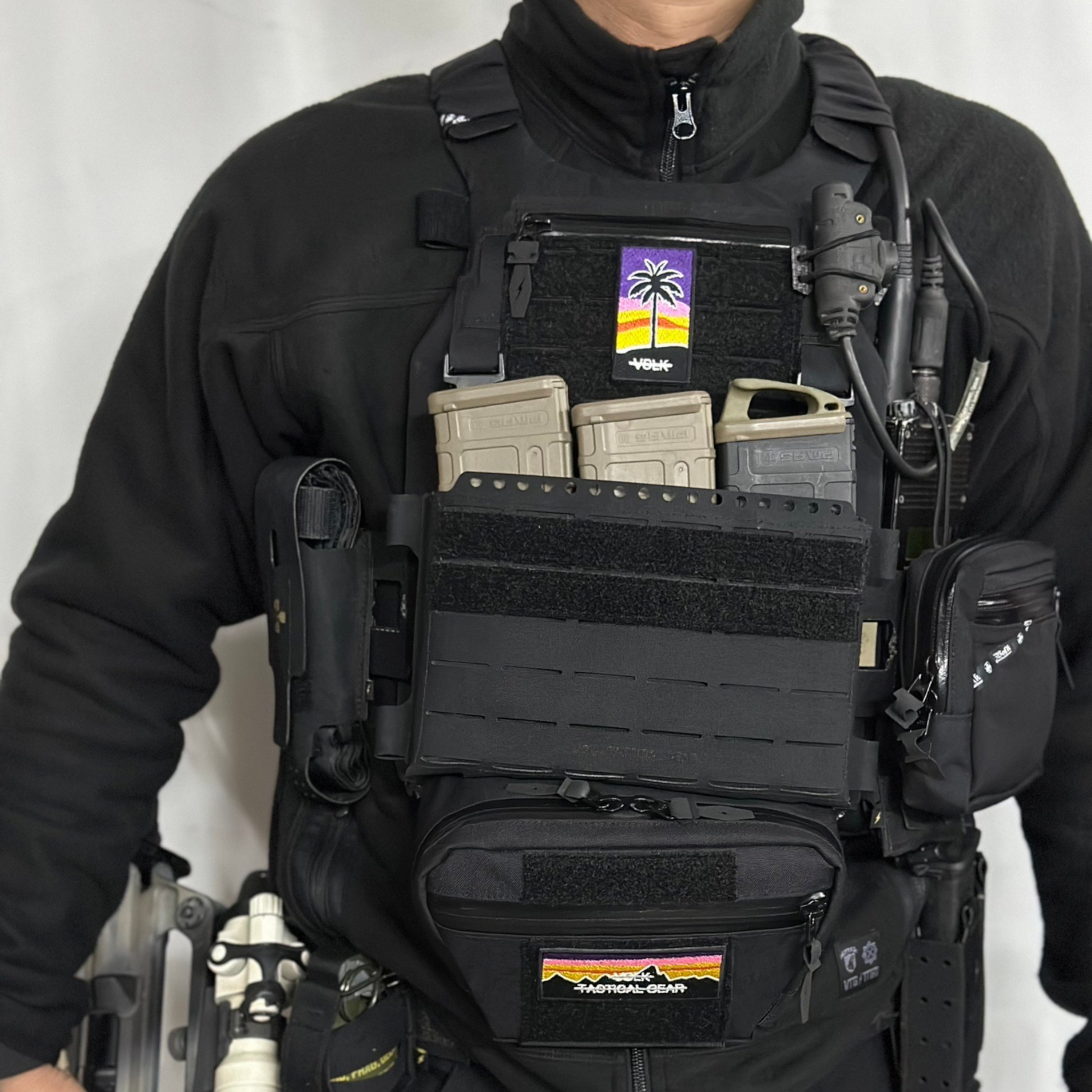 両側面にはウェビングモールを2段に配し、カラビナ等の携行や1連仕様の小型ポーチの追加装備も可能です。底部にはエラスティック製のホルダーを配備、CAT(止血帯)等の固定、携行が可能です。