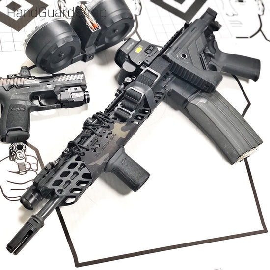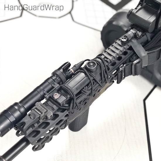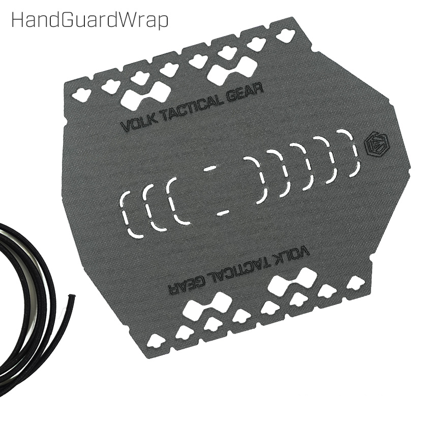 HandGuardWrapをハンドガードに巻きつけ、両端の矢印型の穴に付属のショックコードを通してレイルの溝に合わせて編み込みます。