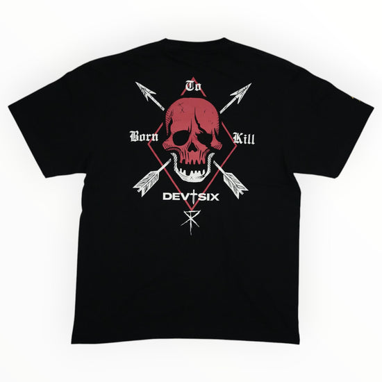 DEVTSIXとのコラボで生まれた本作は、"BORN TO KILL" のメッセージを掲げたレッドスカルとクロスアローの組み合わせが背面を飾る一枚。