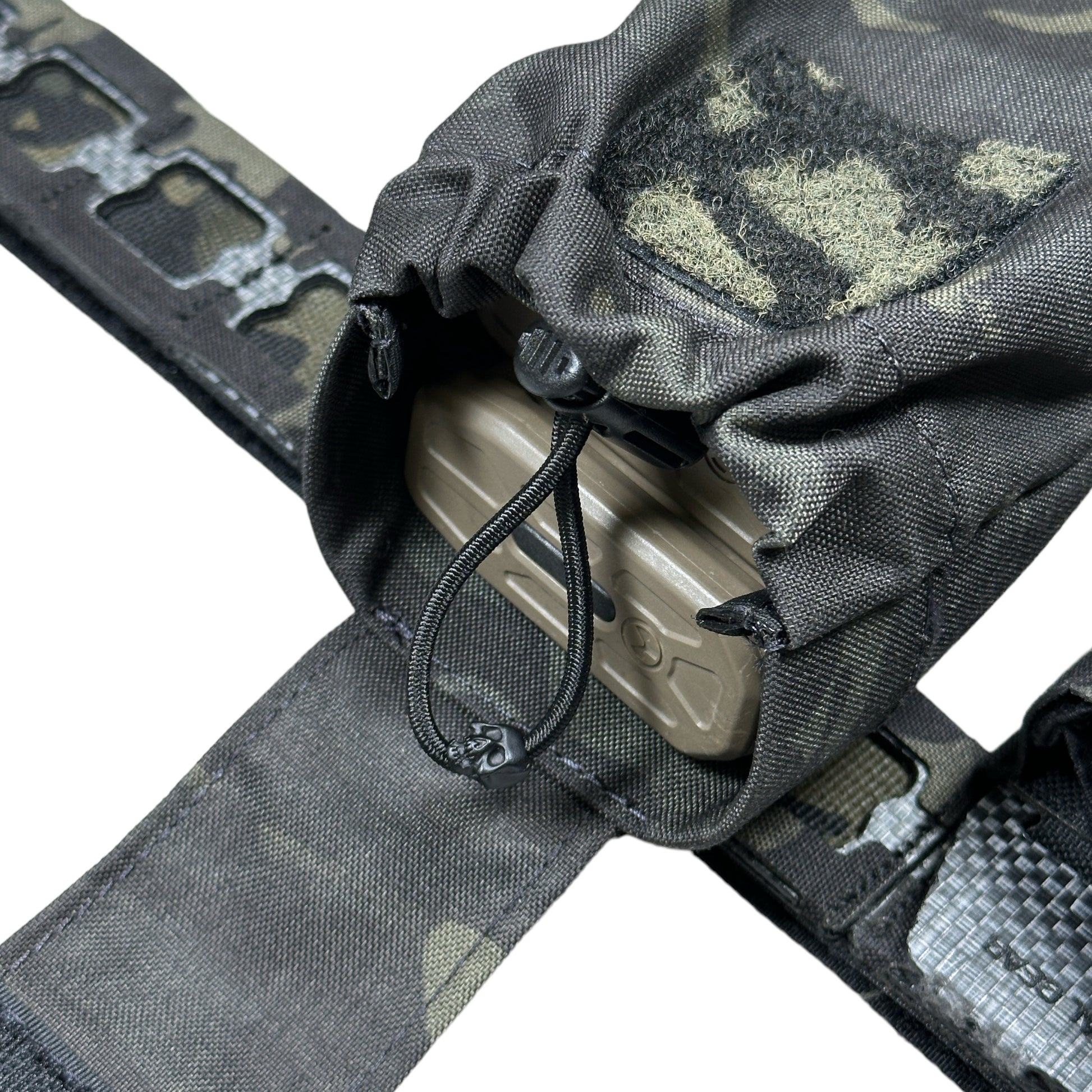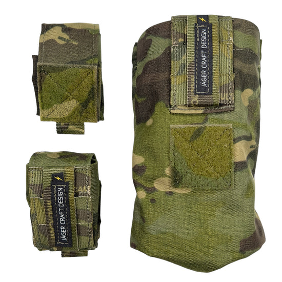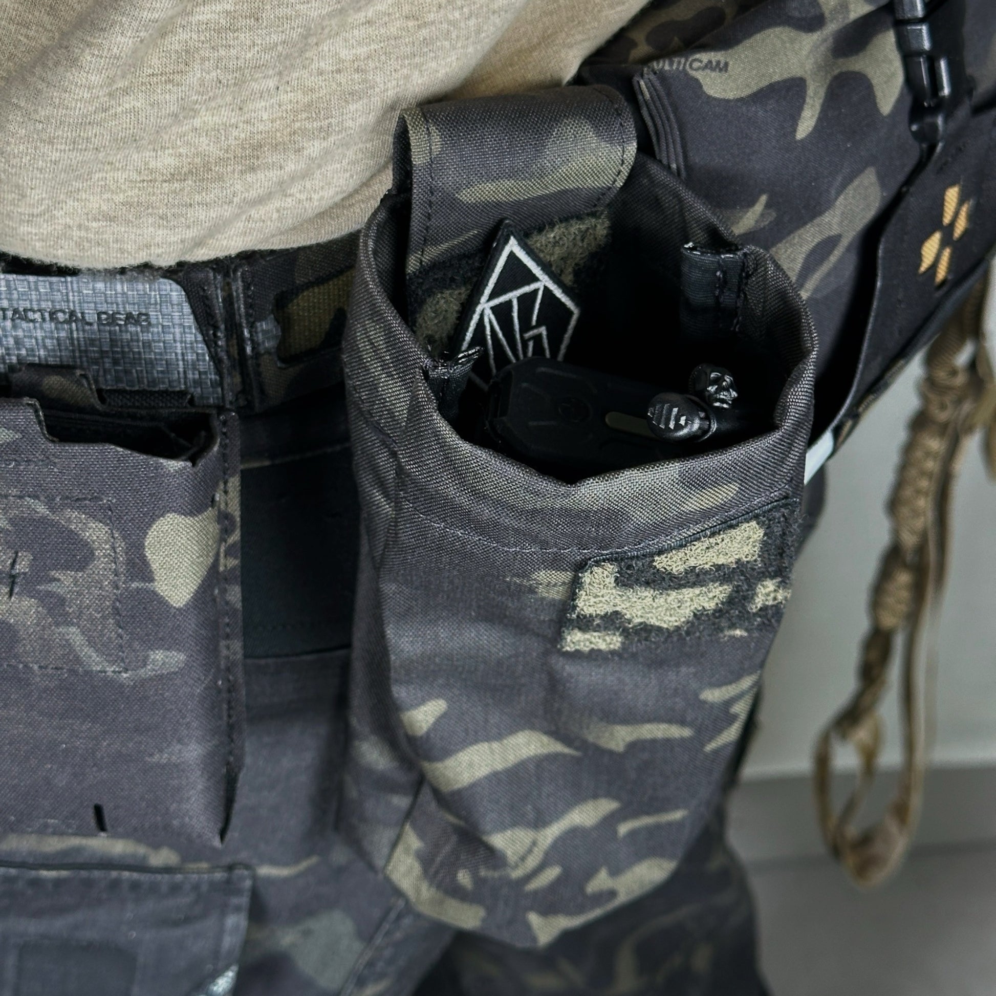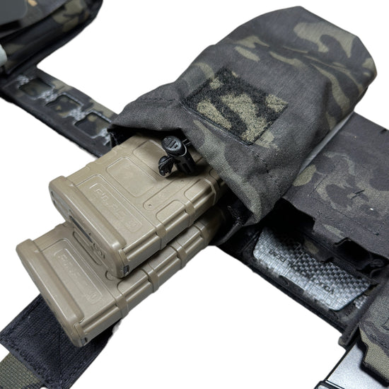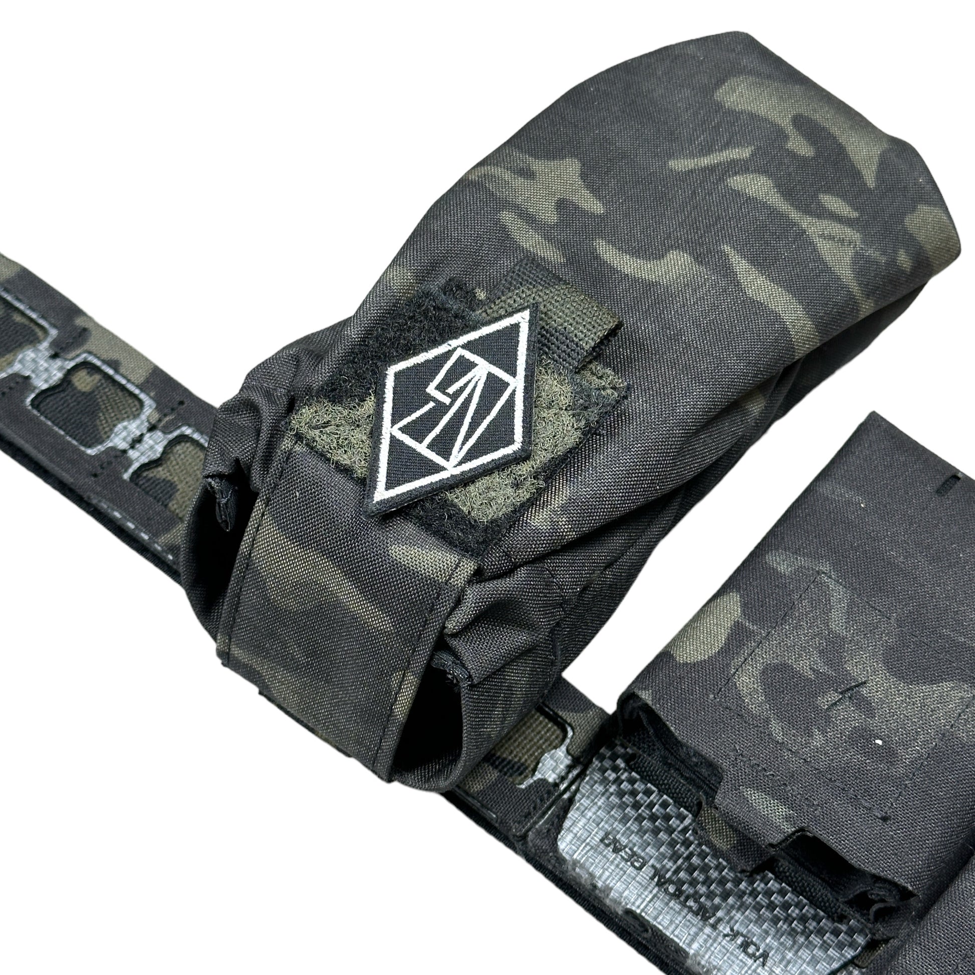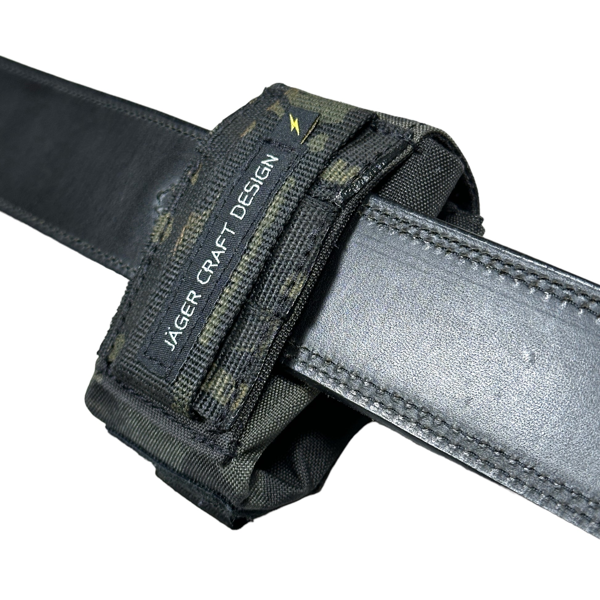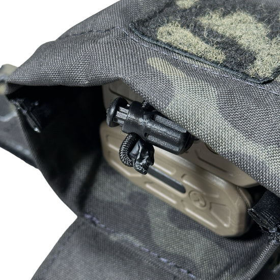 従来仕様からフラップ長を1cm伸ばし、ベルクロパイルを追加しました。このマイナーチェンジによりポーチ解放後もフラップを脱落防止に活かせる様になりました。更に従来までは縦側に折り畳む時は三つ折りだったのが、二つ折りでも固定出来る様になり、折り畳み時の厚みも抑えられました。