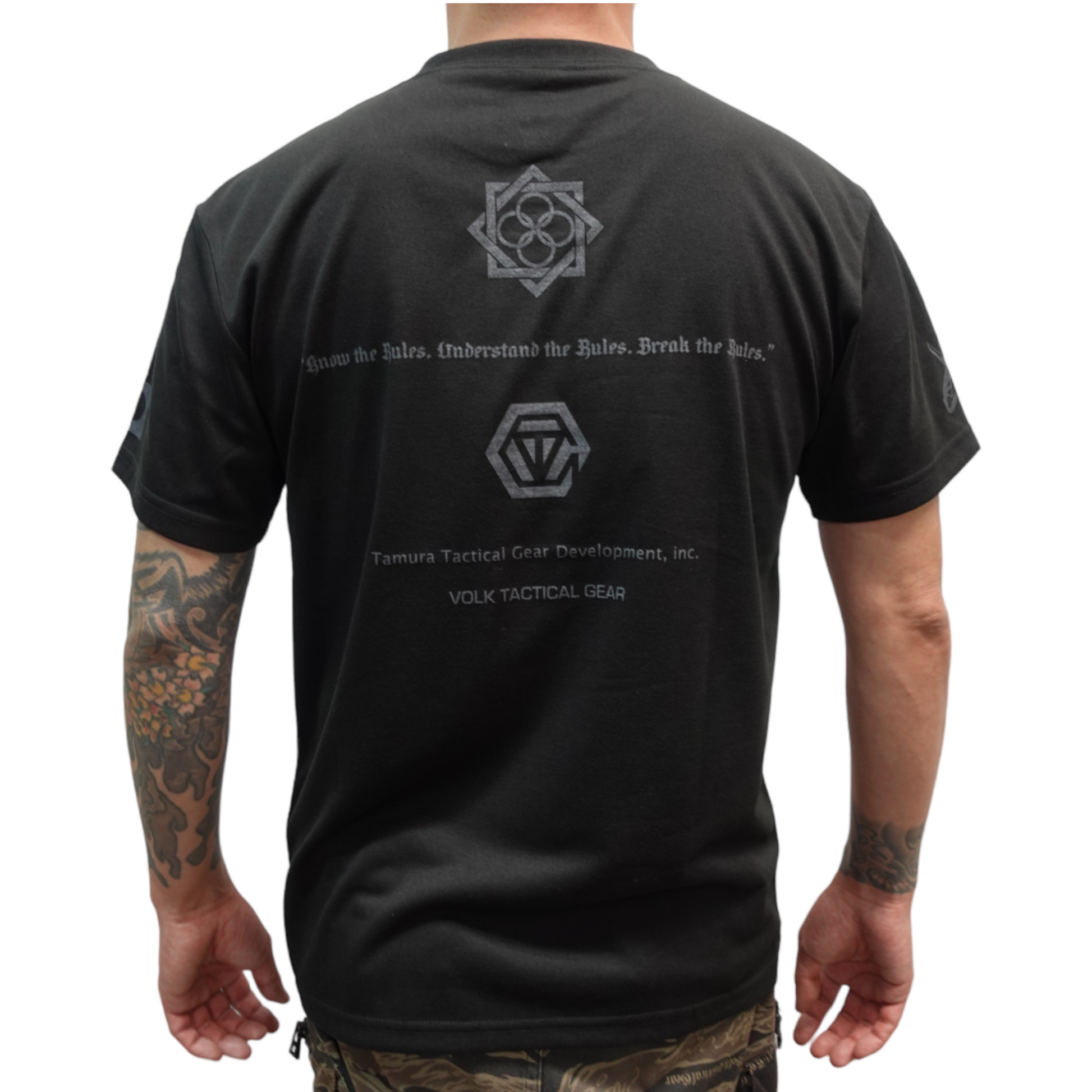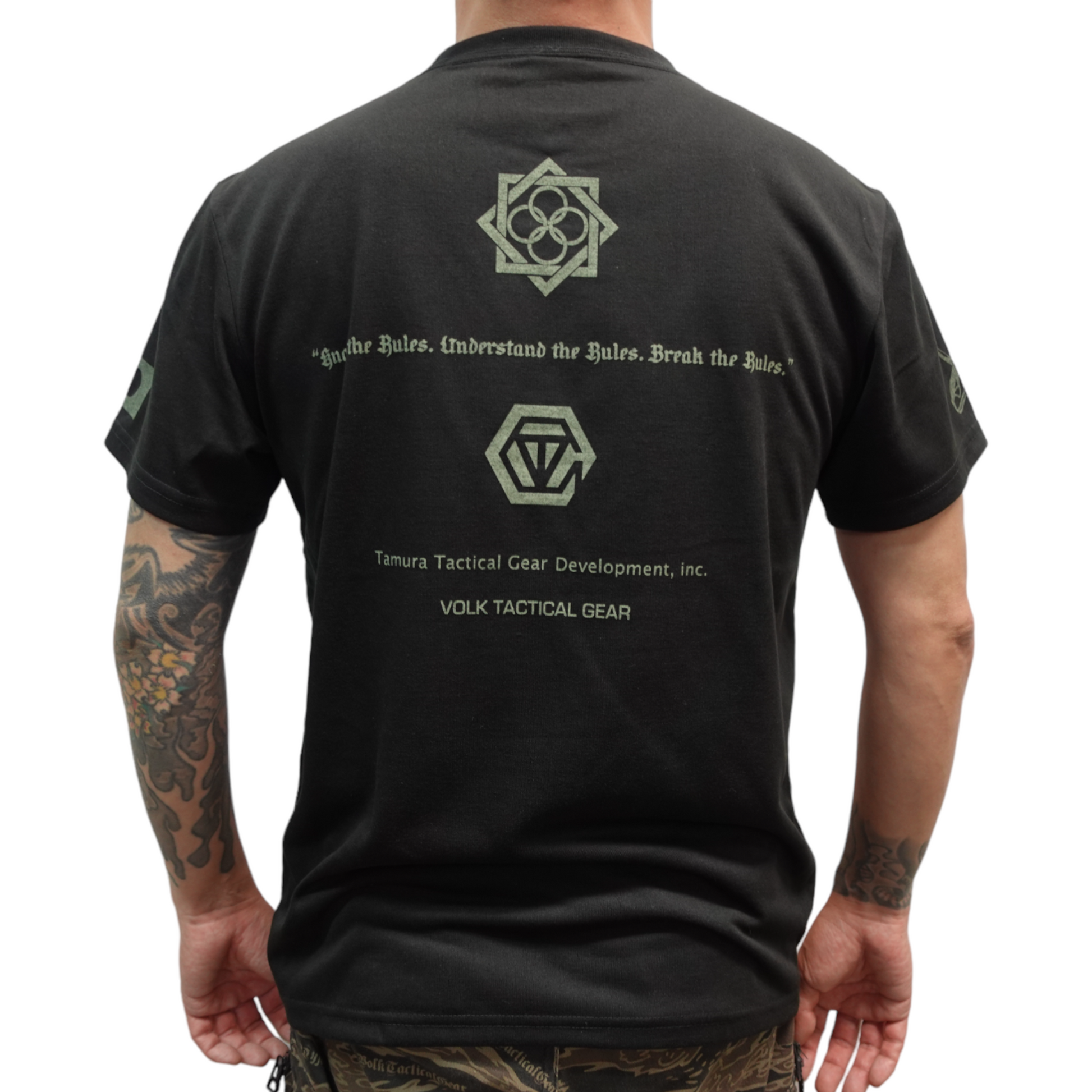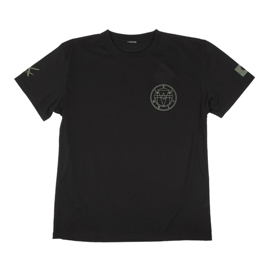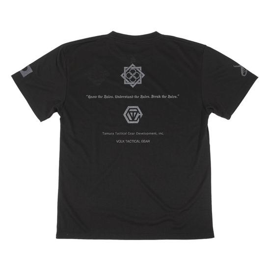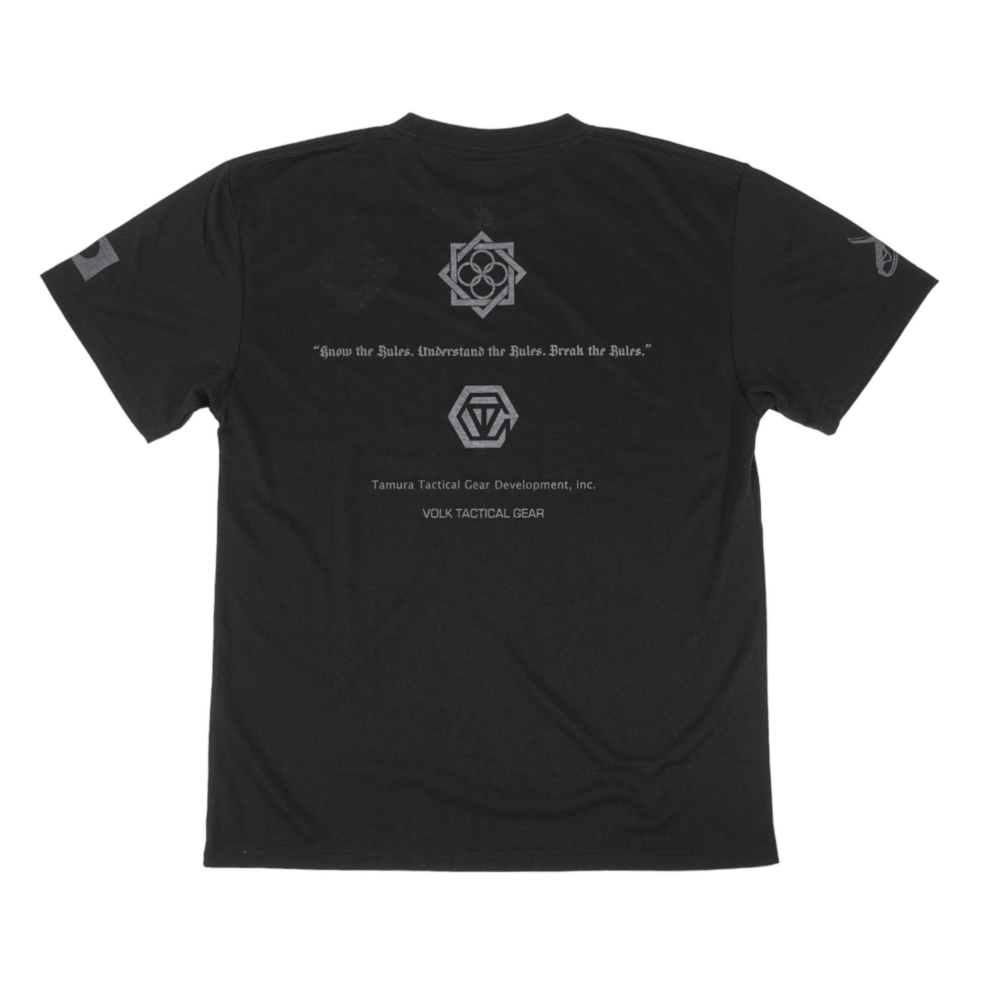 胸のプリントはVOLK TACTICAL GEARと田村装備開発の頭文字 VTGとTTGDを、シジルをモチーフに古代ヘブライ文字を配したデザインです。