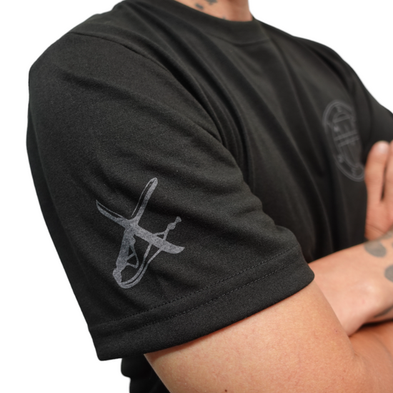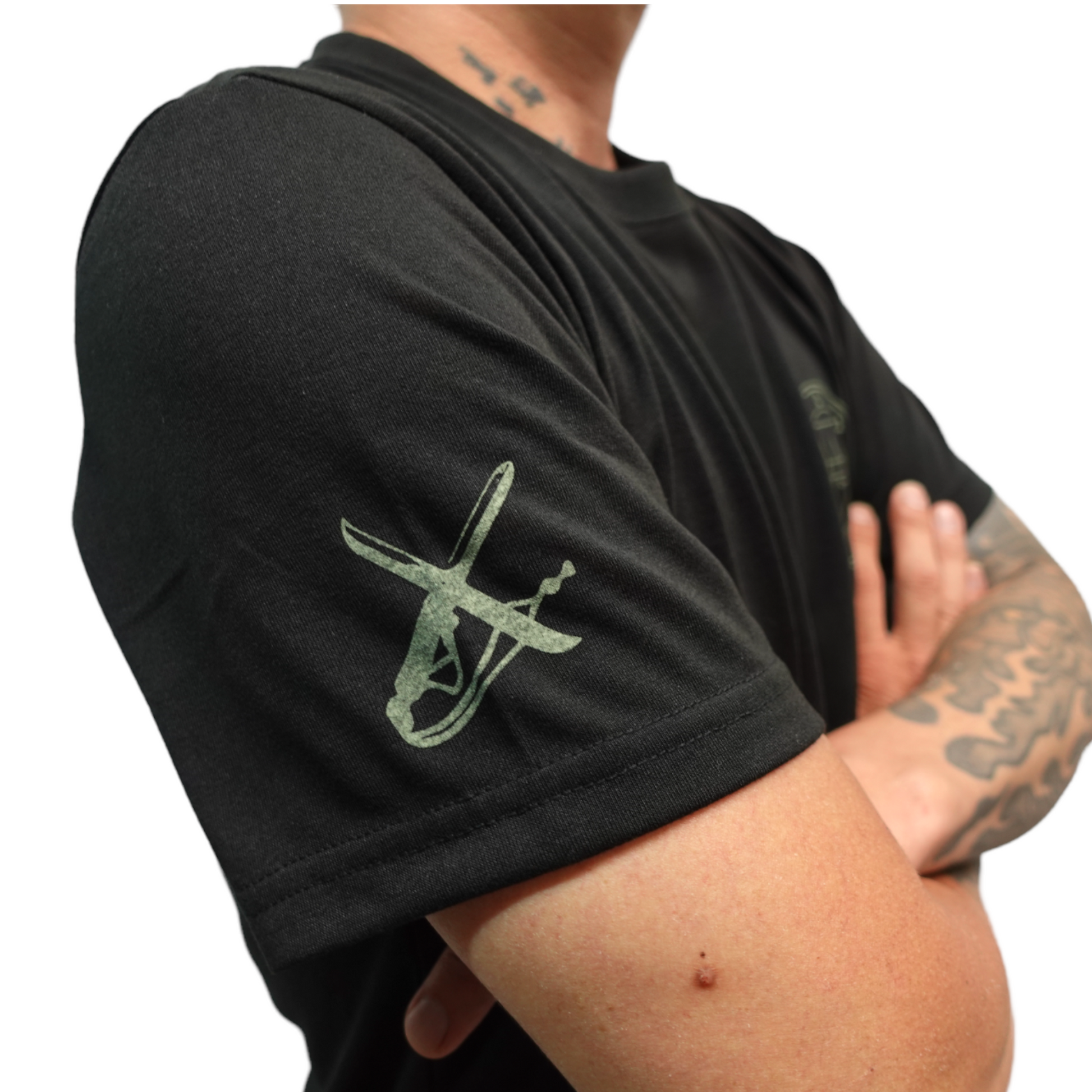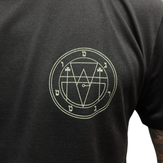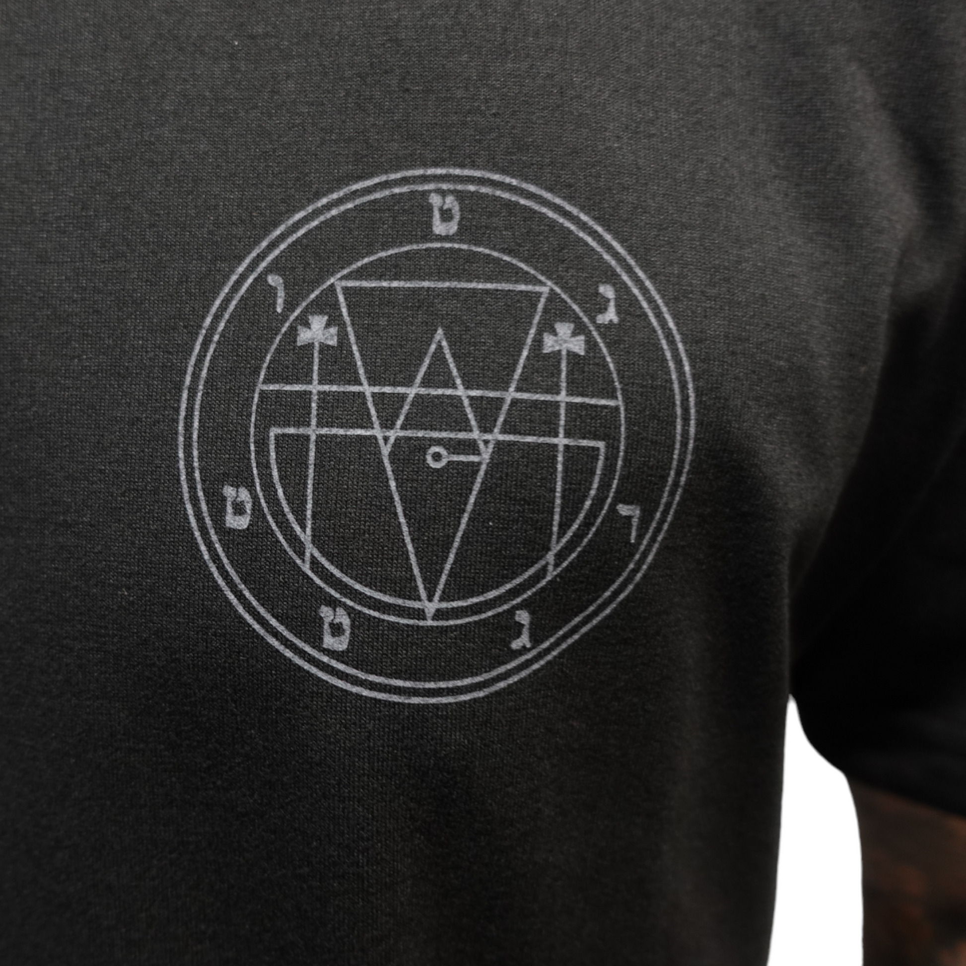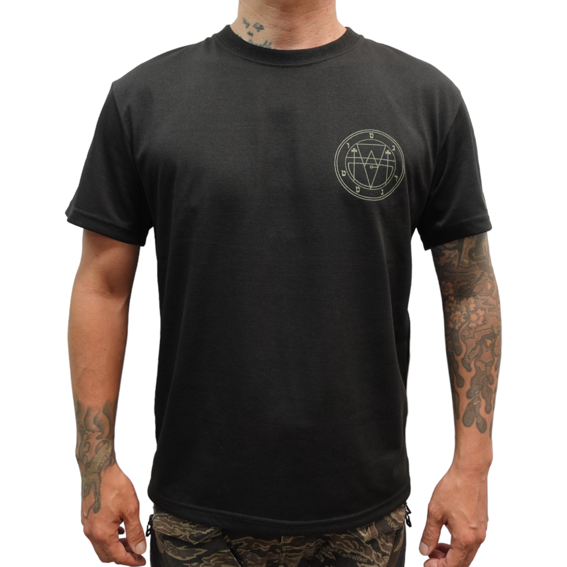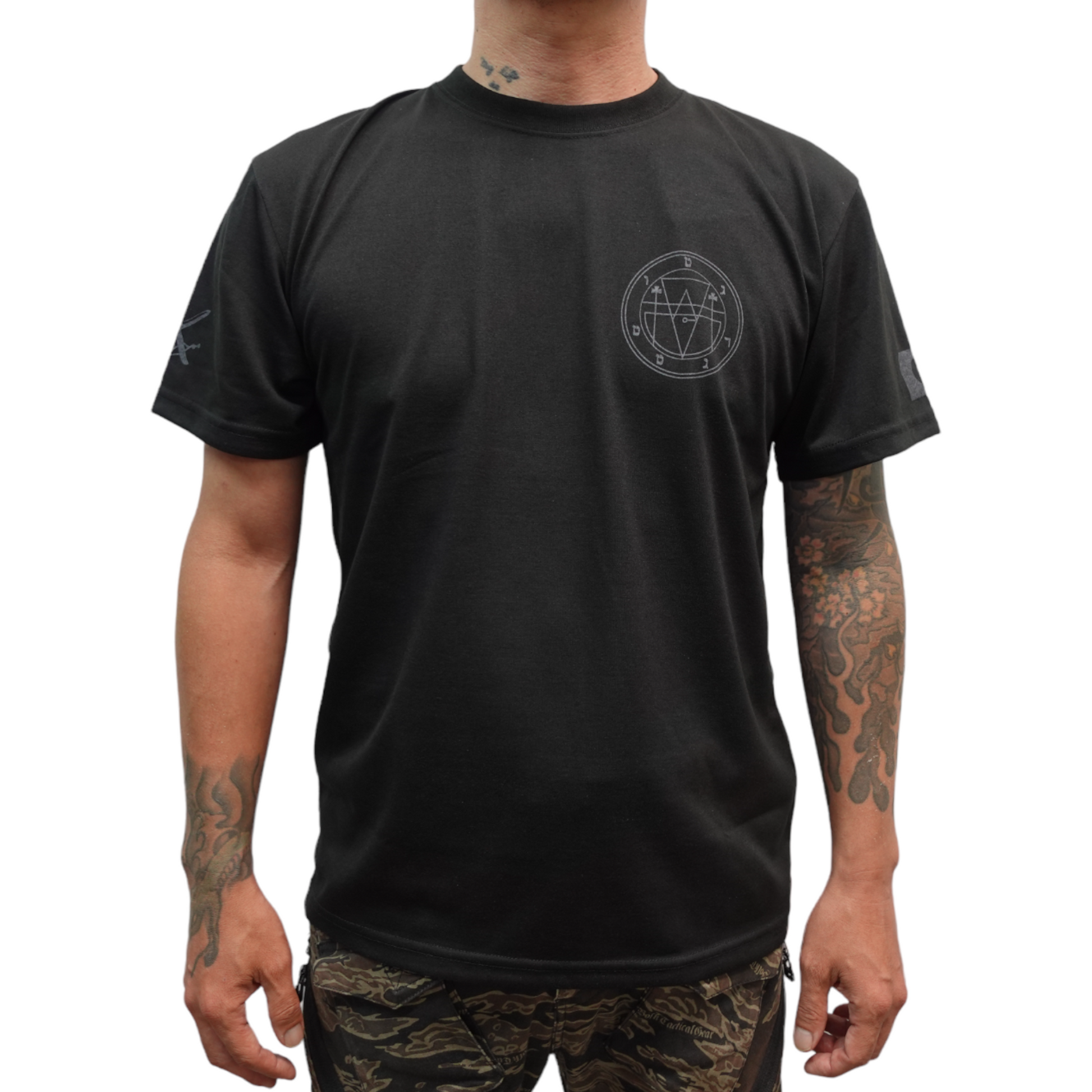 胸のプリントはVOLK TACTICAL GEARと田村装備開発の頭文字 VTGとTTGDを、シジルをモチーフに古代ヘブライ文字を配したデザインです。