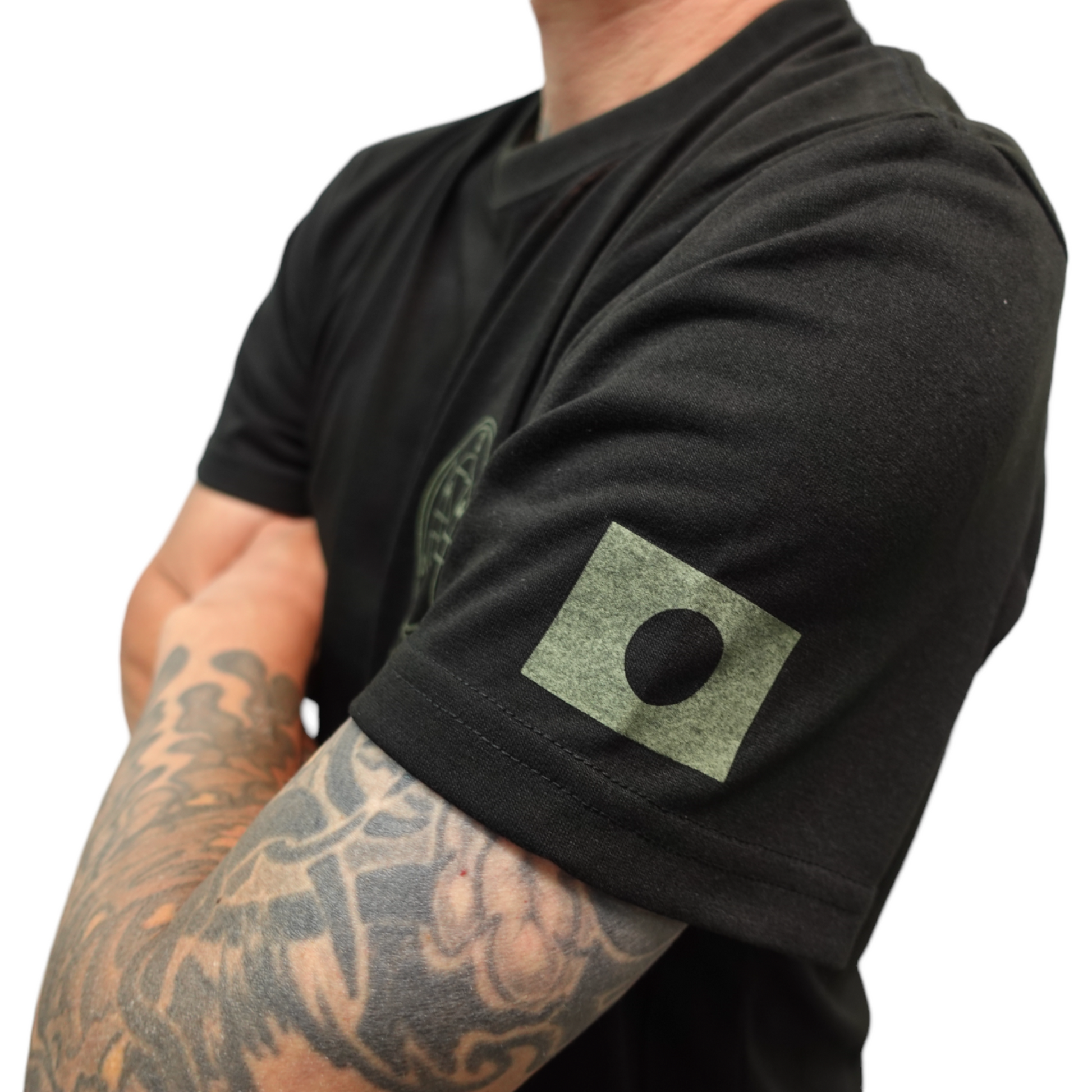 背中には田村装備開発のロゴと、VTGのヘックスロゴの間に守破離を英語で記しています。左袖に日本国旗、右袖には江戸時代の上級捕吏が用いたとされる十手の一種、マロホシのデザインをプリントしています。