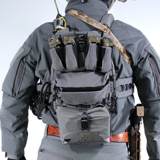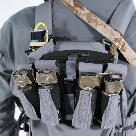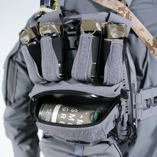 フラッシュバングレネードを4つ携帯できるフラップ付きのポーチと、ジッパー付きのユーティリティポーチを標準配備しています。ユーティリティポーチ背面部はベルクロで固定しており、ハンガーポーチなどを挟み、追加で装着する事も可能です。ポーチ内部にもメス側のベルクロを縫製しており、内部にインサート等を取り付ける事も可能です。